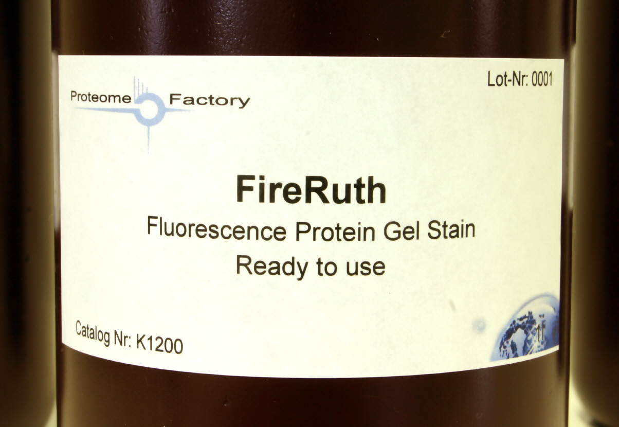 FireRuth is a ready-to-use MS compatible fluorescent staining solution which was specially developed and optimized for high sensitive staining of protein spots and bands from 2DE and SDS-PAGE for subsequent protein identification analysis by mass spectrometry. Proteome Factory’s proteomics lab uses very successfully FireRuth as its standard fluorescent staining for proteomics studies, 2DE and SDS-PAGE in combination with protein identification by nanoLC-ESI-MSMS or MALDI-TOFTOF-MS.